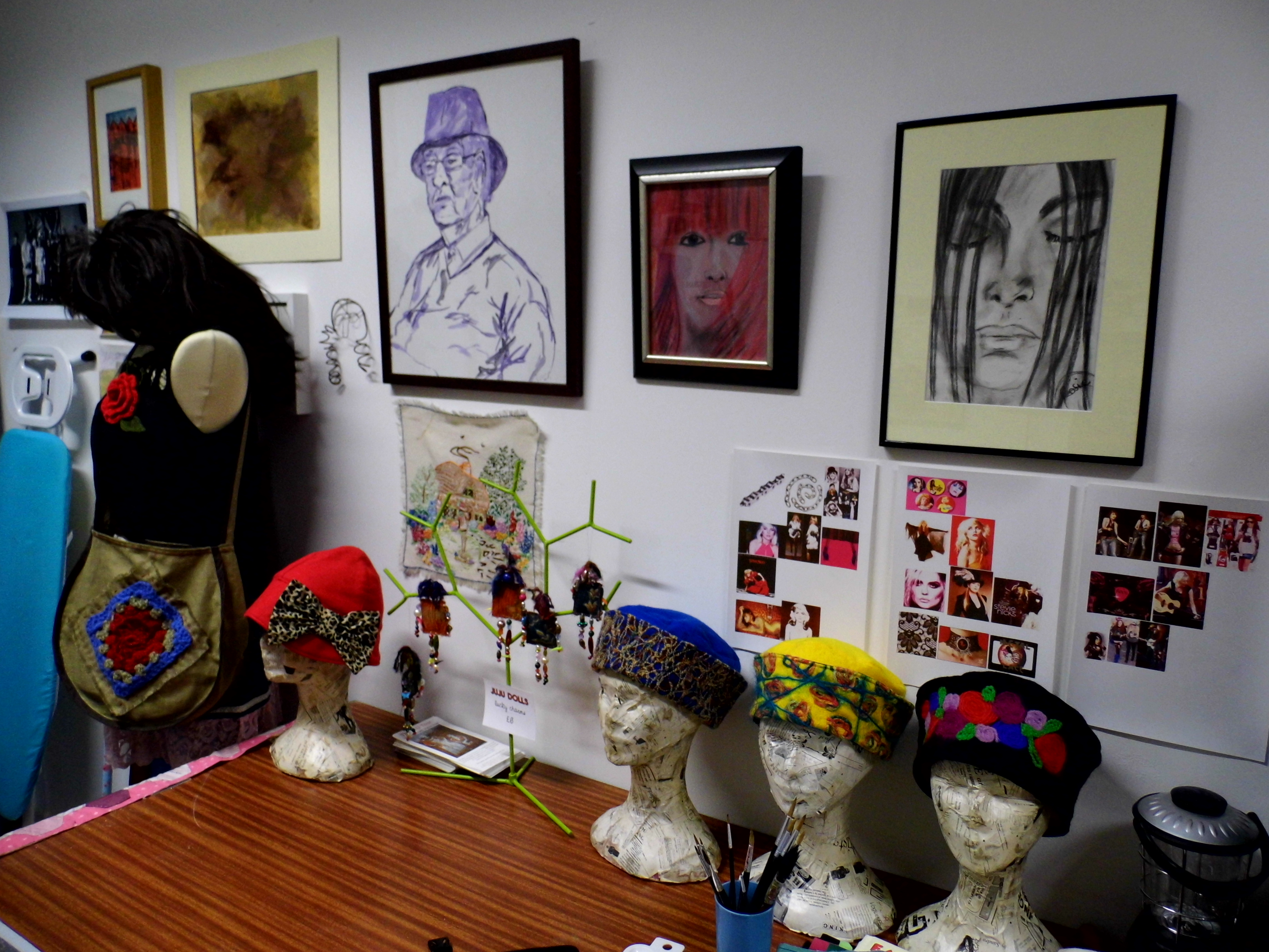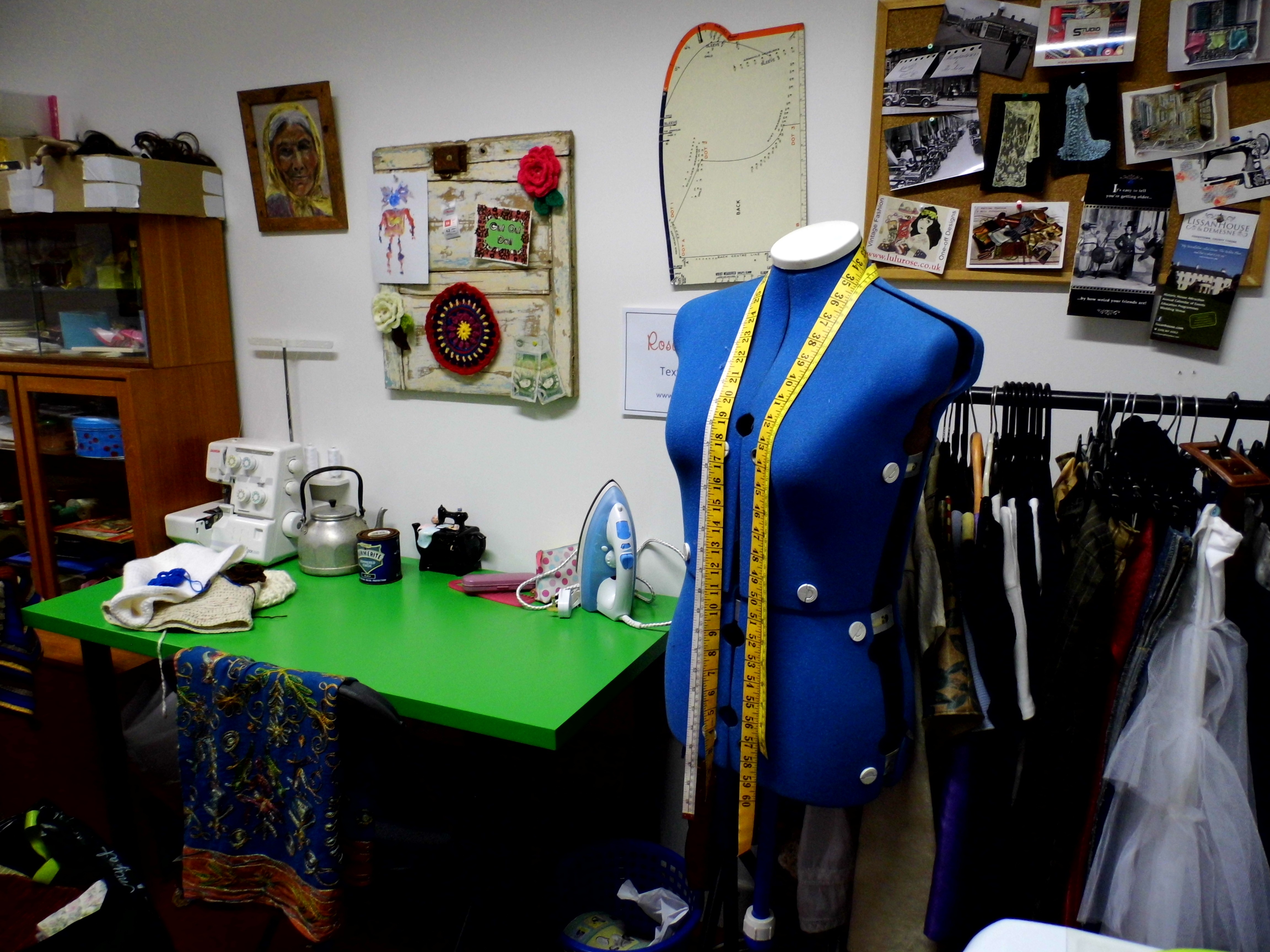 This is my studio, my second home.  I have many visitors and they comment how tidy it is and I excuse the fact by saying that I’m not a messy worker.  Not that I’m anal about it or anything, unless you’re talking about my colour-coded pin cushion, but we’ll brush over that one for now.  I’ll show things in more detail later, don’t want to divulge too much too soon.  You might think I’m transparent and boring and won’t come back.  I’d two meetings here today.  The first was with Anna who has a neighbouring studio and we/I talked a lot about this blog.  The second was with Becky who is my ex studio-mate.  Again we/I talked about this blog.  So now we’re up and running and I’m off to practice my orals for tomorrow.  I’ll do a blog about it.